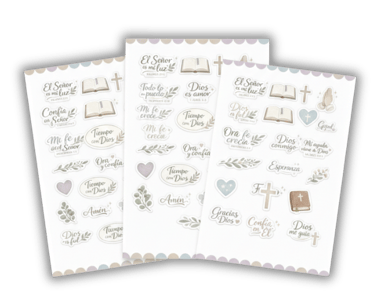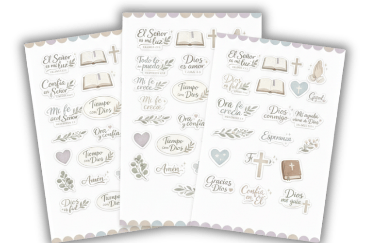 Este set de stickers decorativos incluye frases bíblicas, íconos femeninos y mensajes de fe, pensados para que personalices tu devocional o tu planner y conviertas cada página en una experiencia creativa y espiritual.